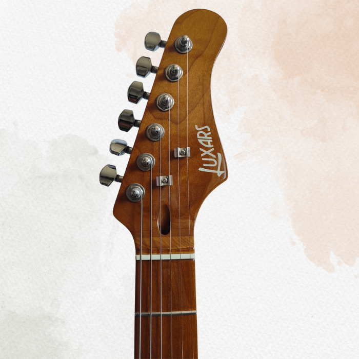 The neck of the Luxars S-G25 Stratocaster electric guitar is a significant feature that contributes to its overall playability and aesthetic appeal. Made from roasted maple, this neck not only offers a distinguished look with its unique wood grain pattern but also provides great stability and sustain. Roasted maple is known for its ability to withstand the rigors of performance and the test of time, making it a preferred choice among guitarists.